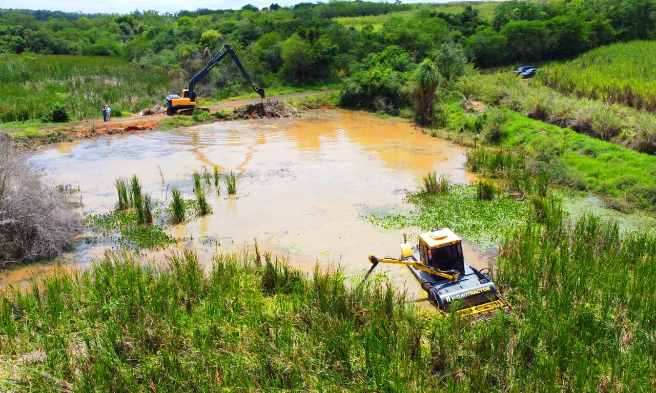 Hidrotractor possui em sua frente de trabalho uma escavadeira de longo alcance, sendo capaz de retirar plantas enraizadas e fazendo o bota fora do material entregue pelo Hidrotractor.